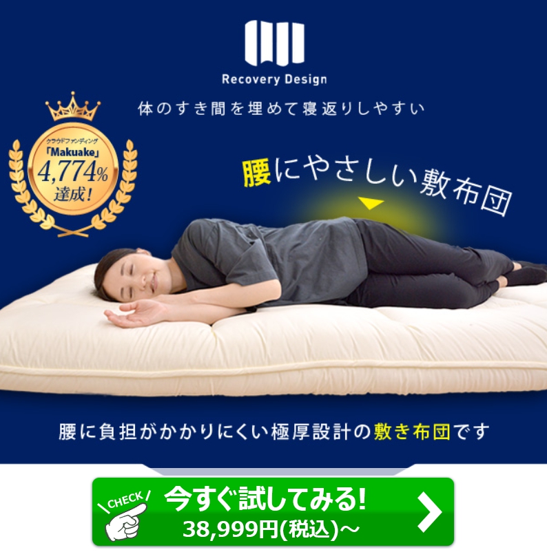 公式サイトはこちら 腰にやさしい敷布団 3つの国家資格を持つ整体師ユーチューバーも紹介する、腰に優しいリカバリーデザイン敷布団です。クラウドファンディングで4774%を達成した、昭和36年創業の老舗布団屋が作った、こだわりの逸品です。体のすき間を埋める7層構造で、寝返りが打ちやすい設計です。 腰に負担がかかりにくい極厚設計で、熟睡をサポートします。高反発ハイブリッド構造で体圧を分散し、30日間の返品保証が付いているので安心してお試しいただけます。ダニ対策や吸水速乾機能も備え、快適な睡眠環境をお得に手に入れられます。 商品名 腰にやさしい敷布団 カテゴリ 生活