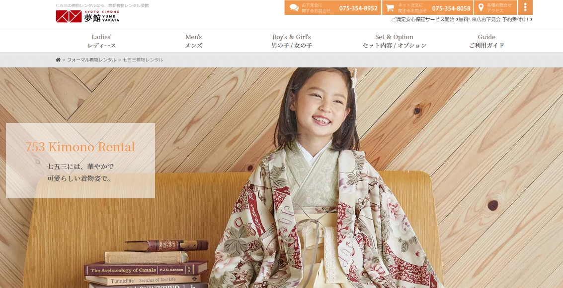 京都で創業16年の着物レンタル店「夢館」です。七五三の衣装、結婚式にぴったりの黒留袖や訪問着など、メディアにも多数掲載された信頼の品を豊富にご用意しています。持ち運びに便利な宅配バッグで、全国どこへでもお届け。フルセットレンタルで、着付け小物から草履まで全て揃います。