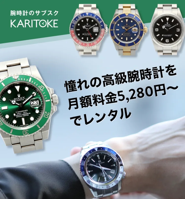公式サイトはこちら 高級 腕時計 レンタル ROLEX、HUBLOT、OMEGAなど人気ブランド腕時計を月額5,280円(税込)から楽しめるサブスクリプション「カリトケ」。買う前に試したい、気分で着け替えたい方に最適です。50ブランド1,300種類以上から選べます。 往復送料無料で、気に入ったら購入できる商品も多数ご用意。さらに通常使用による軽微な傷は保証でカバーされるため、修理費用はかかりません。1ヶ月だけの利用もOK。高額な腕時計をお得に試せるサービスです。 商品名 高級 腕時計 レンタル カテゴリ ファッション