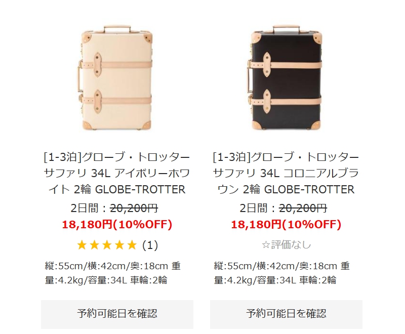 公式サイトはこちら グローブ トロッター レンタル 日本最大のスーツケースレンタル専門サイトです。リモワ、サムソナイトなど人気ブランドのスーツケースを5,000個以上ご用意。往復送料無料、即日発送、無償保証の安心サービス付きで、初めての方でも気軽にご利用いただけます。 買うよりもお得に、高品質なブランドスーツケースをレンタルしませんか。ご希望のサイズや色も豊富に揃っています。購入を検討中の方も、まずはお得なレンタルでお試しください。 商品名 グローブ トロッター レンタル カテゴリ 旅行