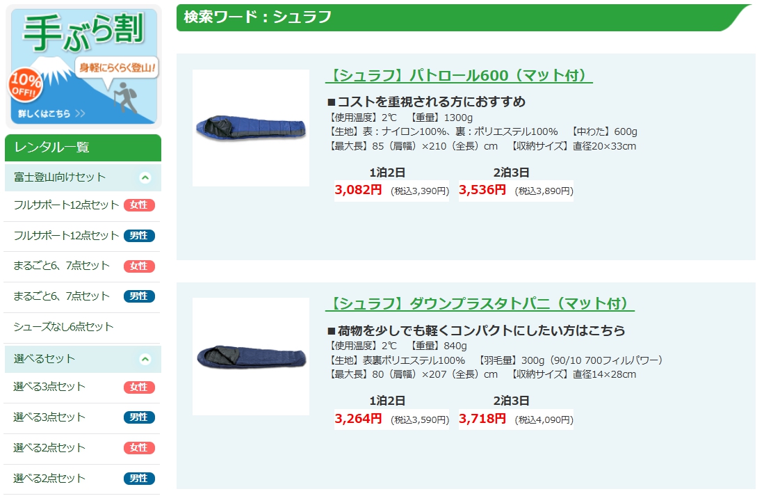 | 商品名 | レンタル シュラフ |