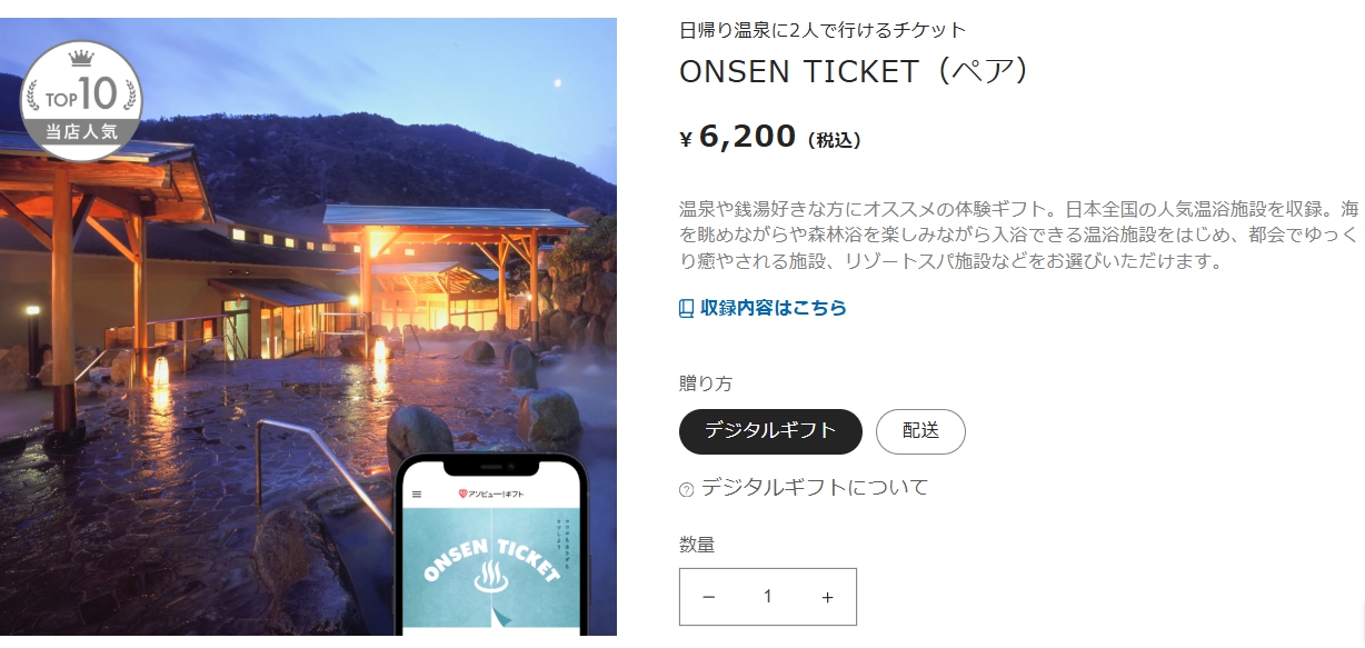公式サイトはこちら ONSEN TICKET コトを贈る体験ギフト! 体験専門サイト「アソビュー!」が22,000プランから厳選した満足度の高い体験をお届けします。エステ、温泉、星つきディナーからパラグライダーまで、最大約622種類から選べるので、お相手にぴったりの思い出がきっと見つかります。 購入後すぐに贈れるデジタルギフトなら、住所不要でSNSやメールで送付可能! 忙しい時や住所がわからない方へのプレゼントもお得に解決します。記念日や結婚祝い、景品などどんなシーンでも活躍する心に残るギフトをどうぞ。 商品名 ONSEN TICKET カテゴリ 生活,趣味