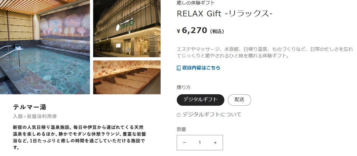 公式サイトはこちら RELAX Gift コトを贈る体験ギフト! 体験専門サイト「アソビュー!」が22,000プランから厳選した満足度の高い体験をお届けします。エステ、温泉、星つきディナーからパラグライダーまで、最大約622種類から選べるので、お相手にぴったりの思い出がきっと見つかります。 購入後すぐに贈れるデジタルギフトなら、住所不要でSNSやメールで送付可能! 忙しい時や住所がわからない方へのプレゼントもお得に解決します。記念日や結婚祝い、景品などどんなシーンでも活躍する心に残るギフトをどうぞ。 商品名 RELAX Gift カテゴリ 生活,趣味