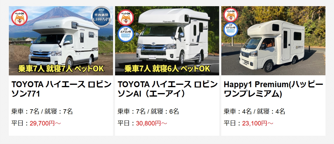 公式サイトはこちら 幕張キャンピングカー レンタル 北海道から沖縄まで、全国各地に展開しているキャンピングカーレンタル! 初心者にも安心のレンタル専用オリジナル車両で、ファミリーや友人と快適な旅をしませんか。利便性と居住性を両立し、全車ペット同乗OKなのが魅力です。 カメラや車載Wi-Fiなど豊富なオプションプランもご提供。ホテルのルームサービス並みのプランもあり、旅がさらに充実します。東京・大阪を含む全国の拠点で、安心かつお得に特別な車中泊体験をお楽しみください 商品名 幕張キャンピングカー レンタル カテゴリ 生活