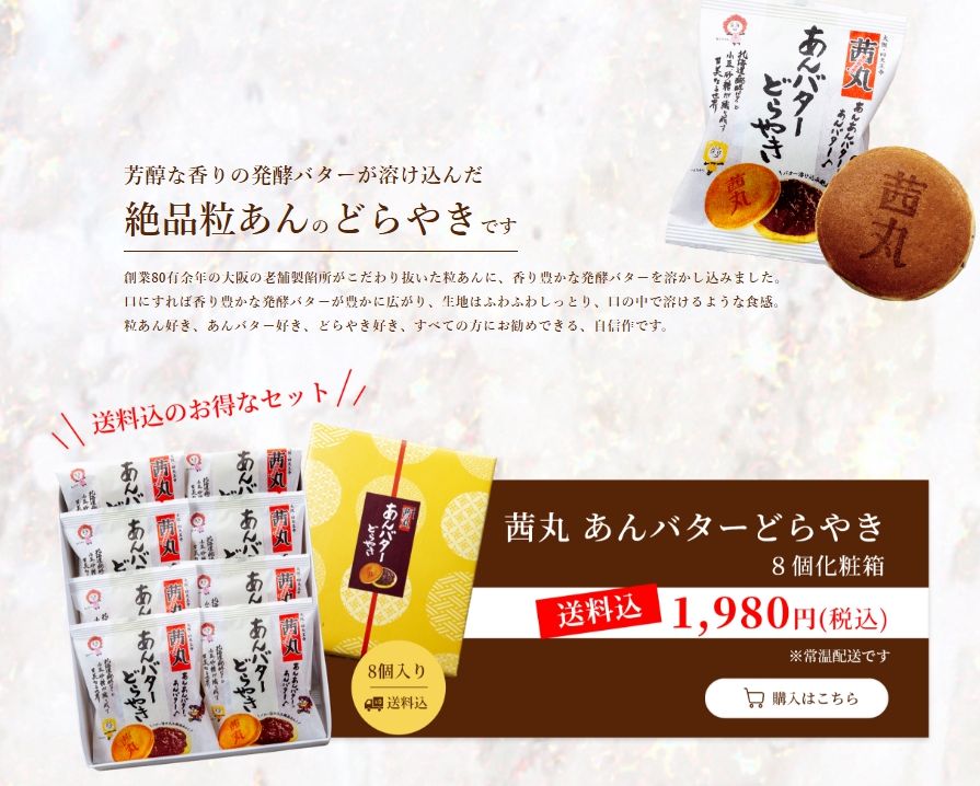 公式サイトはこちら あんバターどら焼き 1940年創業の老舗「茜丸」がお届け! 発売以来、累計6,000万個以上を販売する大阪土産の定番『五色どらやき』が目玉です。安全・安心なあんこと共に、時代に合わせた新しい味わいを追求し続けています。 あんこが苦手な方にもおすすめ! 洋風どらやき『YODORA』や『プリンどらやき』など、社員パティシエ考案の新商品も続々登場しています。10種類のどらやきなど豊富なラインナップから、あなたのお気に入りをお得にお探しください。 商品名 あんバターどら焼き カテゴリ 食品