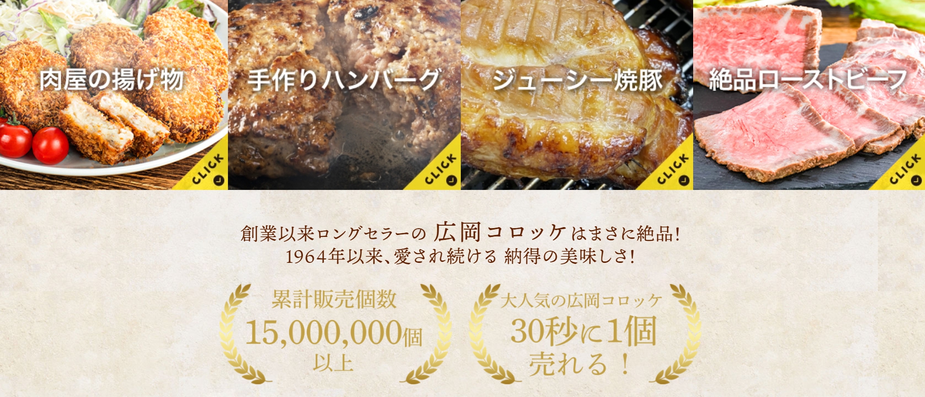 公式サイトはこちら 広岡コロッケ Google評価★4.2、累積販売数1500万食以上! 広岡精肉店のEC販売店です。大人気看板商品の『広岡コロッケ』は「NEWS ZERO」など多数メディアに登場し、各大手百貨店の物産展でもご好評いただきました。 本店レビュー★5.0のハンバーグをはじめ、リピーター人気の高いメンチカツやカツ類など、お惣菜が豊富。単品からお得な詰め合わせまで展開中です。カニクリームコロッケなど、プロの味をご自宅で手軽にお楽しみください。 商品名 広岡コロッケ カテゴリ 食品