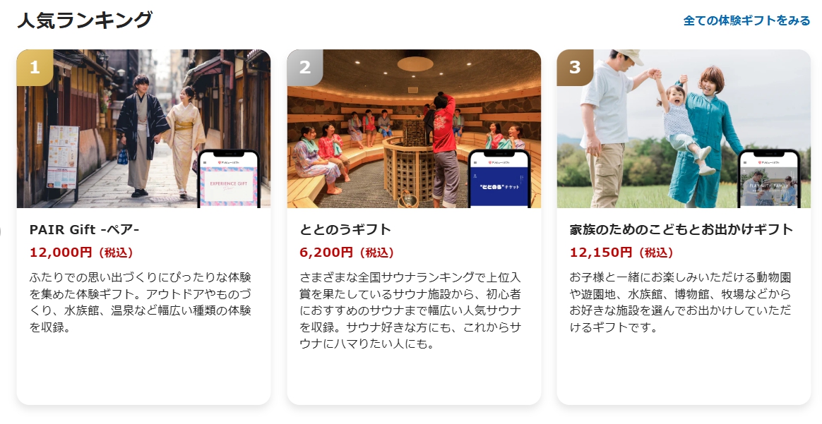 公式サイトはこちら snsで送れるギフト コトを贈る体験ギフト! 体験専門サイト「アソビュー!」が22,000プランから厳選した満足度の高い体験をお届けします。エステ、温泉、星つきディナーからパラグライダーまで、最大約622種類から選べるので、お相手にぴったりの思い出がきっと見つかります。 購入後すぐに贈れるデジタルギフトなら、住所不要でSNSやメールで送付可能! 忙しい時や住所がわからない方へのプレゼントもお得に解決します。記念日や結婚祝い、景品などどんなシーンでも活躍する心に残るギフトをどうぞ。 商品名 snsで送れるギフト カテゴリ 生活,趣味