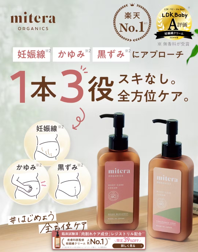 公式サイトはこちら 妊娠の黒ずみクリーム 新しい発想から生まれた、妊娠中の「かゆみ」「くすみ」に特化したオーガニッククリーム mitera(ミテラ)。保湿はもちろん、かゆみや黒ずみ解消のための有効成分を徹底研究。皮膚科医監修のもと、天然由来成分のみを贅沢に配合しました。 6つの無添加で、デリケートな妊娠中から産後の肌、さらには赤ちゃんのお肌にも安心してお使いいただけます。一本で家族全員のボディケアにもなるため大変お得です。快適なマタニティライフをサポートするmiteraをお試しください。 商品名 妊娠の黒ずみクリーム カテゴリ 生活