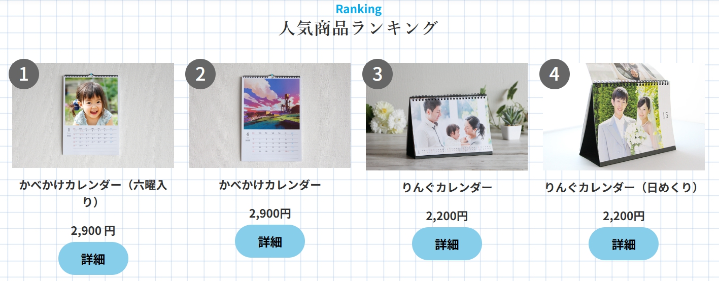 A3サイズの高品質カレンダーが2,700円(税込)とお手頃価格。さらに、同一商品を4冊以上購入すると、お得な「ボリュームディスカウント価格」が適用されます。ご自宅用はもちろん、ご家族やご友人へのプレゼントにも最適です。高品質なのにリーズナブルで、賢くお得にカレンダーを作成しましょう。
