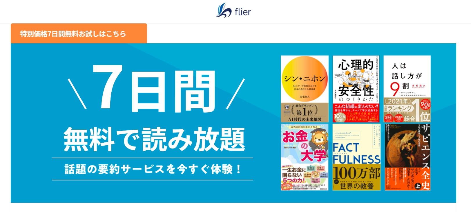 忙しいビジネスパーソンのための10分時短読書「本の要約サイトflier(フライヤー)」です。通勤時間などのスキマ時間を活用して、年間365冊追加される要約で効率的にスキルアップ。著名な経営者や専門家が選んだ、読み応えのある1,400冊以上の蔵書から、お得に知識と教養を身につけられます。
