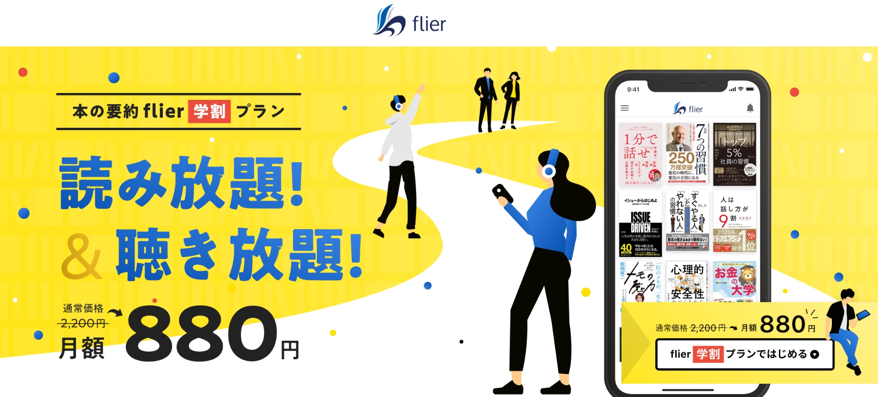 忙しいビジネスパーソンのための10分時短読書「本の要約サイトflier(フライヤー)」です。通勤時間などのスキマ時間を活用して、年間365冊追加される要約で効率的にスキルアップ。著名な経営者や専門家が選んだ、読み応えのある1,400冊以上の蔵書から、お得に知識と教養を身につけられます。