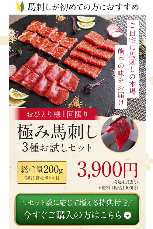 熊本生まれ、熊本育ちの純国産馬刺しを全国へお届けします。市場に出回る輸入品とは一線を画す、熊本肥育の“重種馬”を使用。赤身の旨味と脂のバランスがよく、とろける食感と豊かな旨みが魅力です。初回限定のお得なセットで、本物の味をぜひご家庭でお試しください。