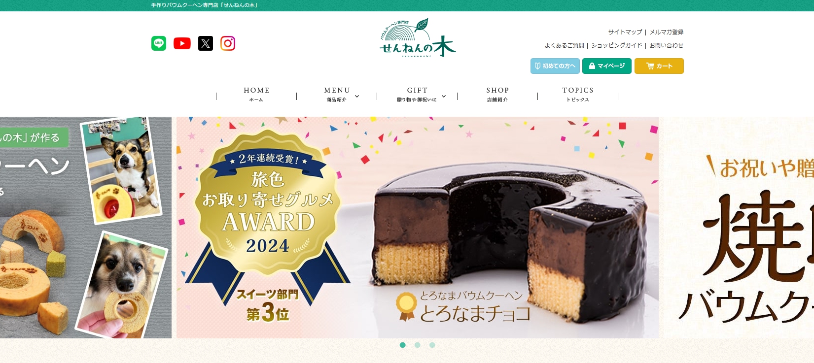 バウムクーヘン専門店「せんねんの木オンラインショップ」です。バウムクーヘンとムースを組み合わせた、新食感のハイブリッドバウムが人気。特に「とろなまチョコ」や「とろなまティラミス」は、20〜40代の女性に好評です。お得なキャンペーンで、この特別な味わいをお楽しみください。