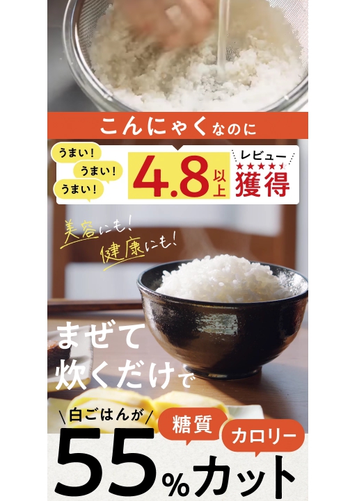 公式サイトはこちら 糖質制限米 「痩せたいけど白米が好き」というダイエッターの夢を叶える、管理栄養士監修のこんにゃく米「50RICE」です。お米と一緒に炊くだけで、カロリーと糖質を50%カット。美容と健康にうれしい酵素や乳酸菌も摂れます。 こんにゃく米特有の匂いがなく、美味しく続けられます。食物繊維は7倍、カルシウムは18倍と栄養豊富。無農薬・無着色で、長期常温保存や冷凍も可能です。お得な価格で、無理なく美味しいダイエットを始めませんか。 商品名 糖質制限米 カテゴリ 食品