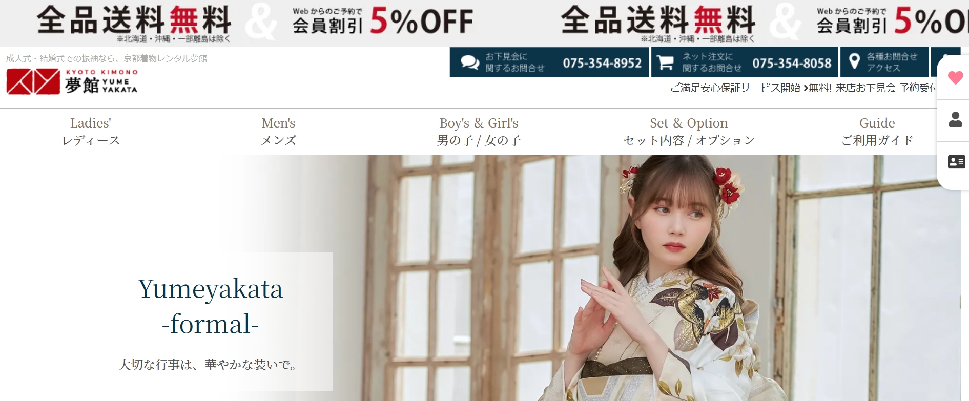 公式サイトはこちら 振袖ネットレンタル 京都で創業16年の着物レンタル店「夢館」です。結婚式にぴったりの黒留袖や訪問着など、メディアにも多数掲載された信頼の品を豊富にご用意しています。持ち運びに便利な宅配バッグで、全国どこへでもお届け。フルセットレンタルで、着付け小物から草履まで全て揃います。 お手頃な9,720円から高級着物まで、幅広い価格帯でご提供。ワイド・トールサイズなど、サイズ展開も豊富です。4泊5日のゆったりレンタルでお得にご利用いただけます。京都の実店舗での無料試着会も開催中。大切な日を、お気に入りの一着で彩りませんか。 商品名 振袖ネットレンタル カテゴリ ファッション