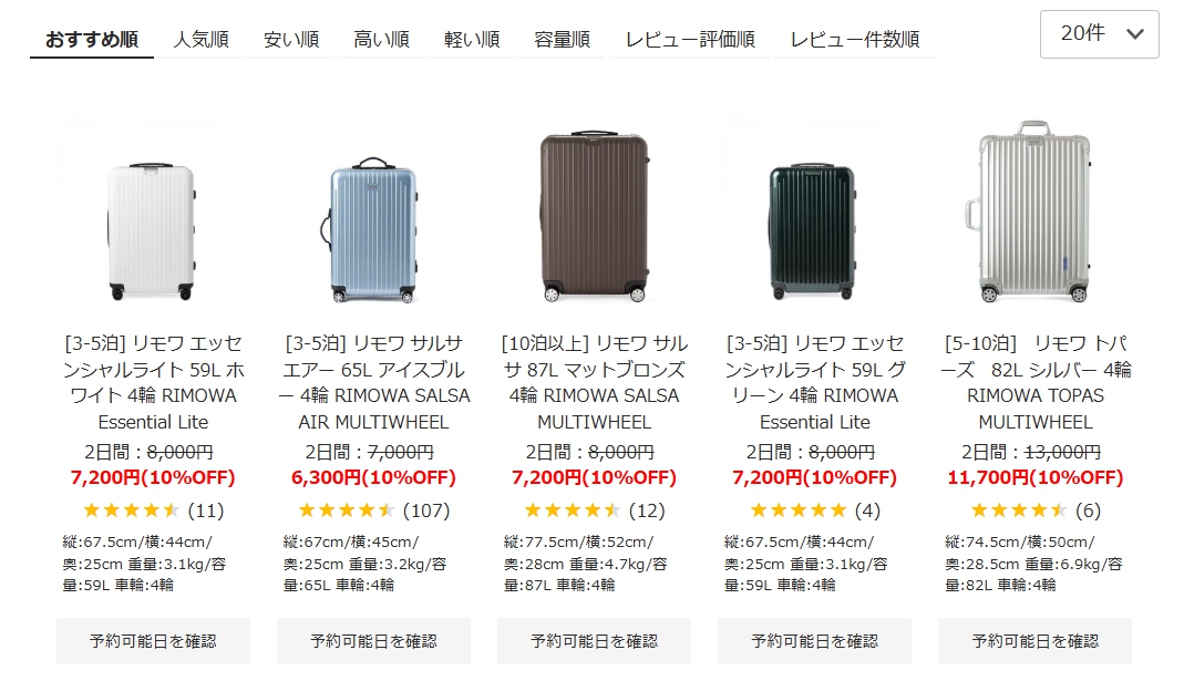 公式サイトはこちら リモワレンタル 日本最大のスーツケースレンタル専門サイトです。リモワ、サムソナイトなど人気ブランドのスーツケースを5,000個以上ご用意。往復送料無料、即日発送、無償保証の安心サービス付きで、初めての方でも気軽にご利用いただけます。 買うよりもお得に、高品質なブランドスーツケースをレンタルしませんか。ご希望のサイズや色も豊富に揃っています。購入を検討中の方も、まずはお得なレンタルでお試しください。 商品名 リモワレンタル カテゴリ 旅行